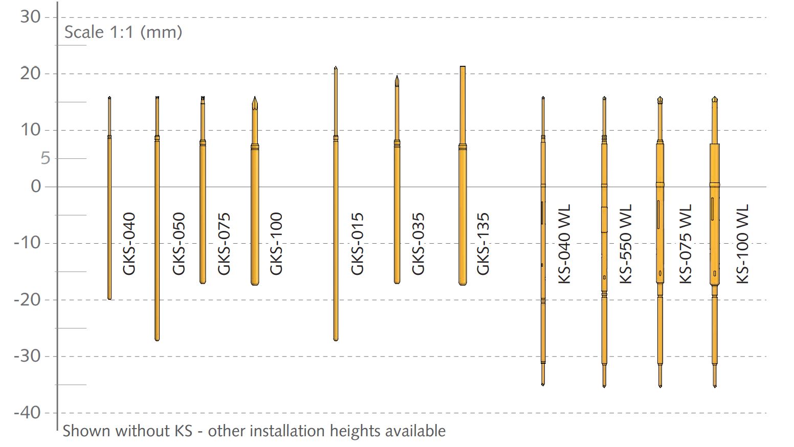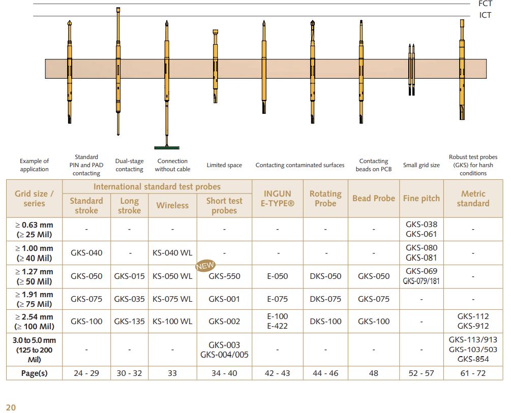 Standard stroke test probes have consistently proven to be reliable ICT/FCT test probes. Depending on the working stroke of the test fixture, or the component or test points to be tested, various installation heights are necessary. These can be achieved by a choice of combinations of test probes and receptacles. Thus, the optimal working stroke with nominal spring force can be achieved.