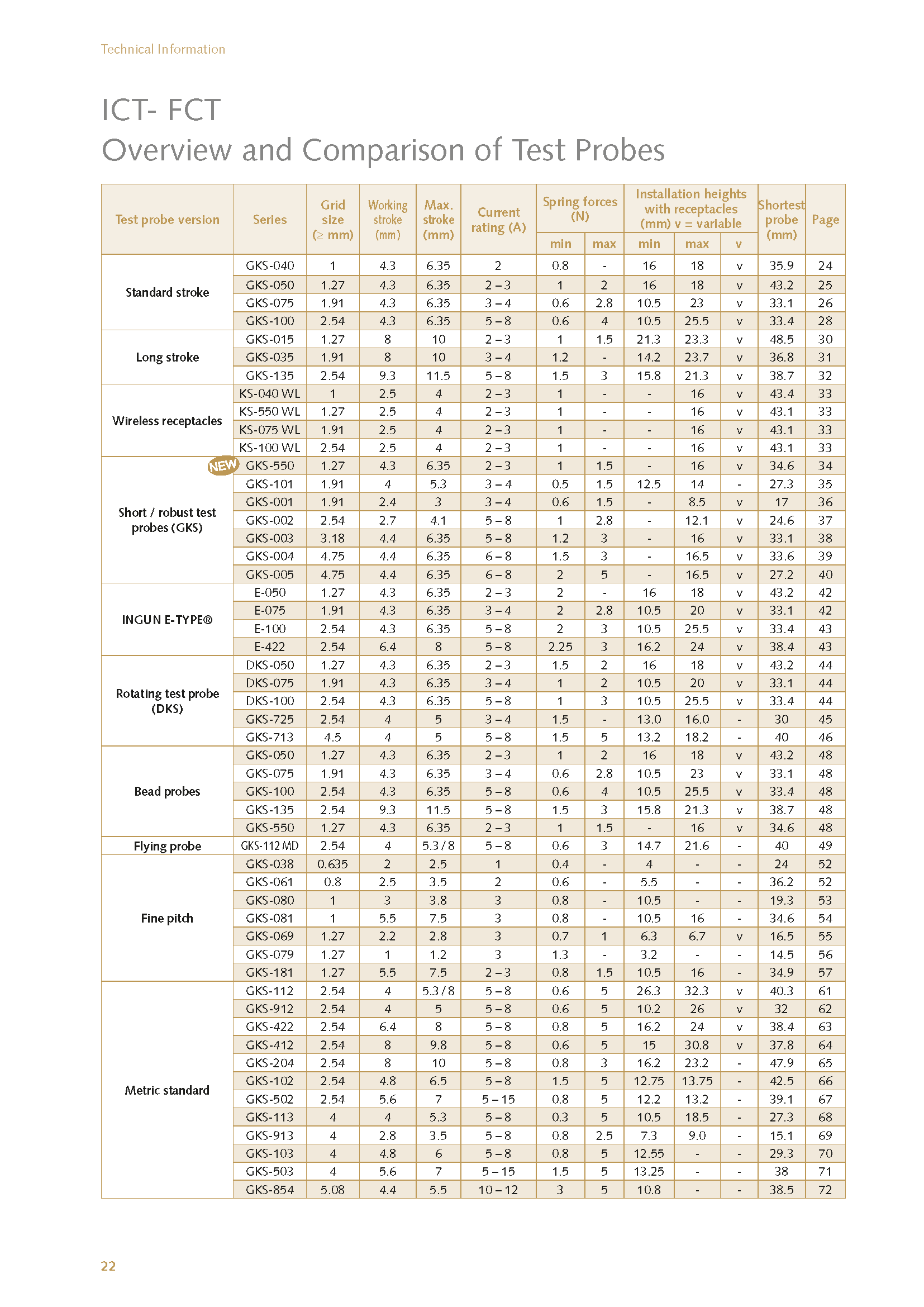 International standard spring-loaded test probes (GKS) (inch) Available in two different versions: Standard working stroke (4.3 mm) and longer working stroke (9.3 mm) for dual- stage test fixtures to combine ICT and FCT.